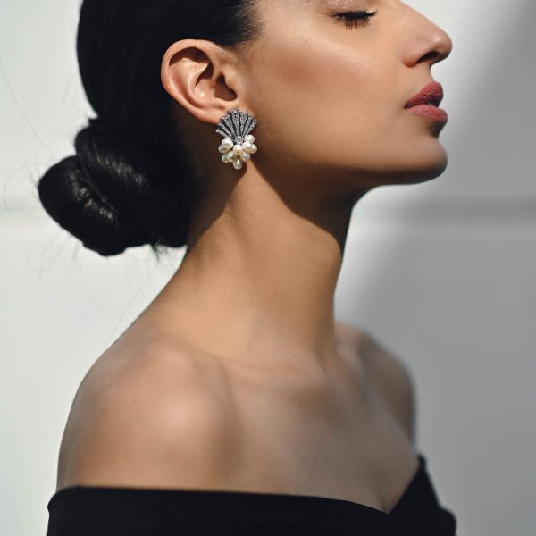 Its special beauty lies in the rich, tonality of the large blue-green carved Mother-of-Pearl. Elevated by the shimmer of diamonds, reminiscent of an oyster, that holds a lustrous freshwater pearl. The pattern of this design gives the illusion of a rectangular formation. A distinctive jewellery piece, that mesmerises all who behold it.